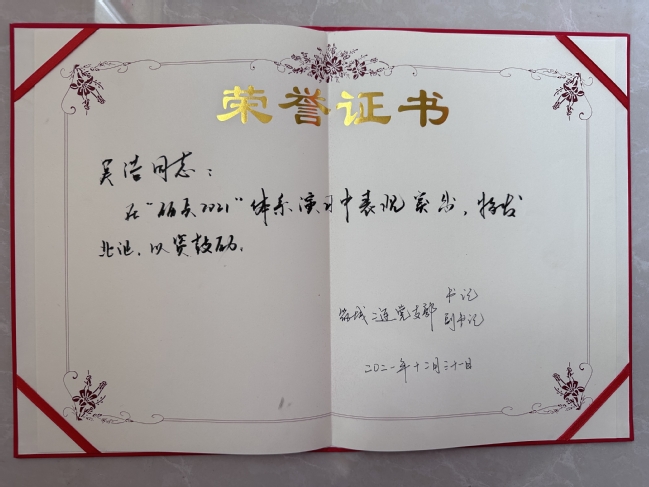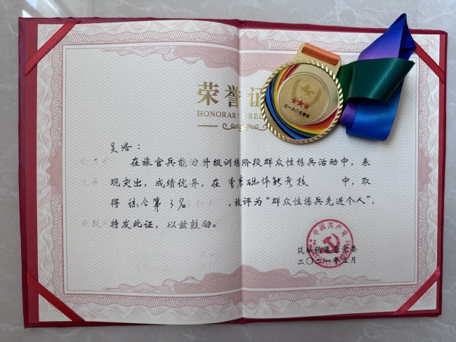 秉持着“逢敌敢亮剑”的精神,我刻苦训练,冲锋在前,不断鞭策自己,努力提高军事技能。体能考核常年全连第一,并在2021年3月的全营群众性练兵比武中取得了“全营体能第三”的佳绩。在2021年底被评选为义务兵骨干,2022年通过了集团军“预提指挥士官”考核,被评为“区队先进个人”。这些成绩的背后,无不体现着我对军营的无限热爱和对军人身份的无比自豪。