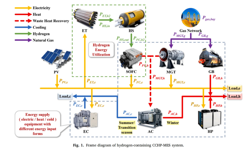 系统优化设计方面,在《Renewable Energy》上发表题为“A preference adjustable capacity configuration optimization method for hydrogen-containing integrated energy system considering dynamic energy efficiency improvement and load fast tracking”的论文,针对含氢综合能源系统提出一种偏好可调的容量配置方法。主要贡献在于在系统设计阶段通过设备选型和容量配置优化,改善系统在后续运行过程中的负荷跟踪动态特性,提升系统能效。相比于传统容量配置方法,论文在容量配置优化问题构建过程中设计添加了能够综合表征系统动态能效和负荷跟踪能力的性能指标,并提出了一种偏好可调的容量配置多目标优化求解方法,可满足不同投资主体对于经济、环保、动态等多项优化目标的容量配置偏好需求,有力推动含氢综合能源系统优化研究,为能源系统规划设计与运行控制提供重要理论和实践支撑。