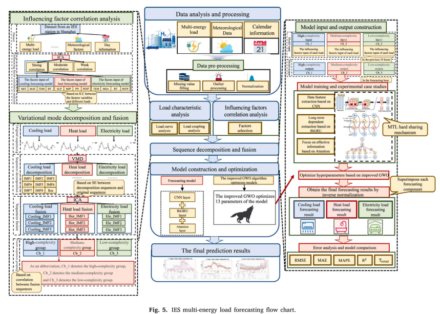 在《Energy》上发表题为“Multi-energy load forecasting for integrated energy system based on sequence decomposition fusion and factors correlation analysis”的论文,提出了一种基于序列分解融合与因素相关性分析的综合能源系统多元负荷预测方法。主要贡献在于运VMD分解复杂负荷序列并融合相关分量,克服模态混叠问题,降低预测难度;通过结合Pearson与基于Copula函数的Spearman秩相关分析的ICA方法,全面考量影响因素与负荷间线性及非线性关系,精准筛选强相关因素,避免传统方法单一相关性分析导致的信息遗漏;构建MTL-CNN-BiGRU-Attention 模型,以BiGRU为硬共享层挖掘负荷耦合信息,并借助注意力机制突出关键特征,提升预测精度;改进GWO算法,引入新策略和收敛因子优化模型超参数,增强搜索效率与收敛速度,使模型在多能源负荷预测上表现更优,有效提高了预测准确性和效率,在不同数据集上均展现出良好的鲁棒性和泛化能力。