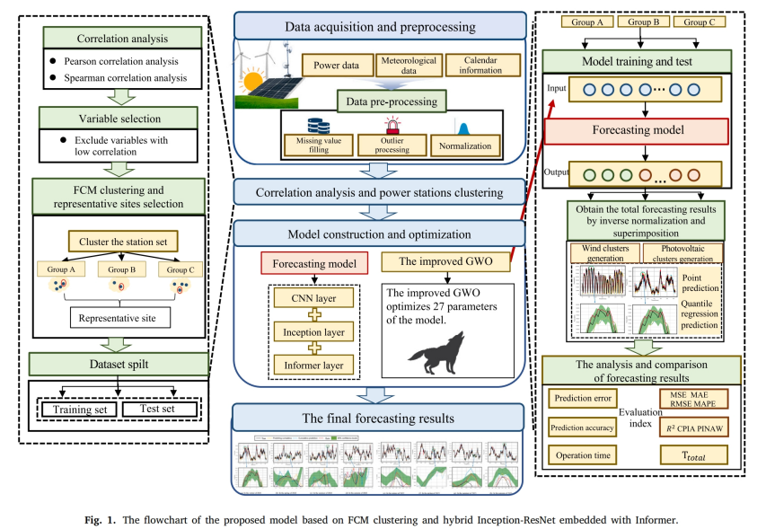 源荷预测方面,在《Energy Conversion and Management》上发表题为“Short-term PV-Wind forecasting of large-scale regional site clusters based on FCM clustering and hybrid Inception-ResNet embedded with Informer”的论文,提出了一种新型区域站点集群短期电力预测模型。主要贡献在于创新性地结合Pearson相关系数和基于Copula函数的Spearman秩相关系数,全面分析发电影响因素的线性与非线性相关性以筛选强相关变量;利用FCM聚类算法对大规模电力集群分类,并通过轮廓系数评估聚类效果选取代表性站点构建数据输入集;构建了融合Inception、ResNet和Informer的深度神经网络模型,能有效捕捉时间序列特征和缓解梯度消失问题;改进GWO算法,引入新策略和收敛因子寻找最优参数,提升模型预测精度与鲁棒性,经实验验证在风电和光伏预测上均优于其他算法,提高了预测的准确性和效率。