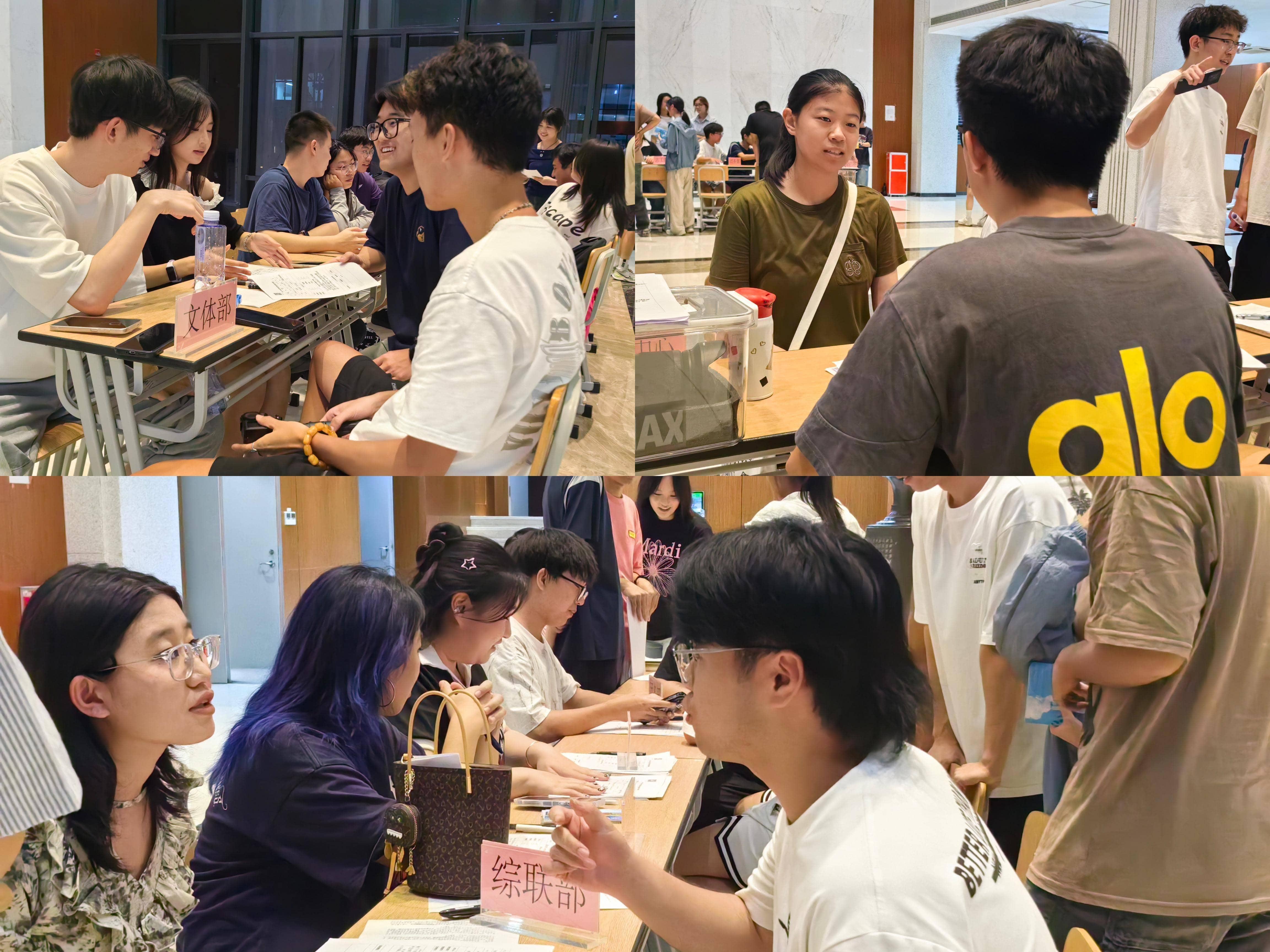 会后,团学纳新活动面试环节在学术楼大厅展开。新同学们驻足心仪的部门摊位前,认真聆听介绍,轻声交流,并填写下属于自己的纳新报名表。负责纳新的学长学姐耐心解答关于部门日常工作、活动形式等问题,分享自己在团学的成长故事,向学弟学妹们展现部门的独特魅力。