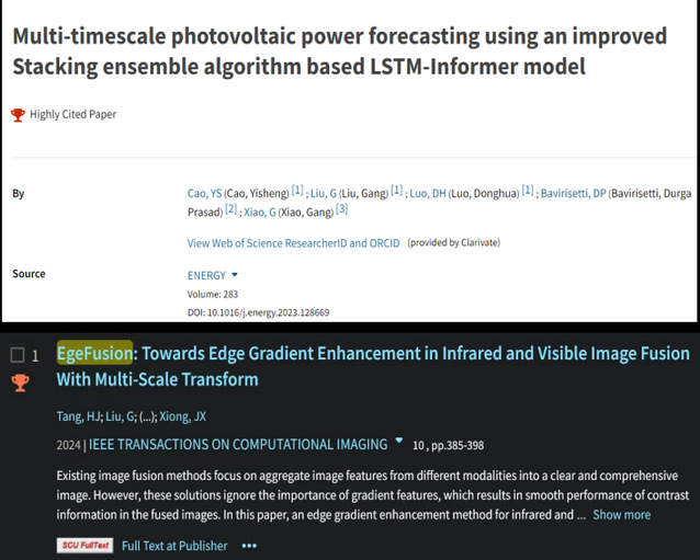 此外,在《Energy》上发表“Multi-timescale photovoltaic power forecasting using an improved Stacking ensemble algorithm based LSTM-Informer model”(DOI: 10.1016/j.energy.2023.128669)和《IEEE Transactions on Computational Imaging》上发表“EgeFusion: Towards Edge Gradient Enhancement in Infrared and Visible Image Fusion With Multi-Scale Transform”(DOI: 10.1109/TCI.2024.3369398)入选全球ESI前1%高被引论文。