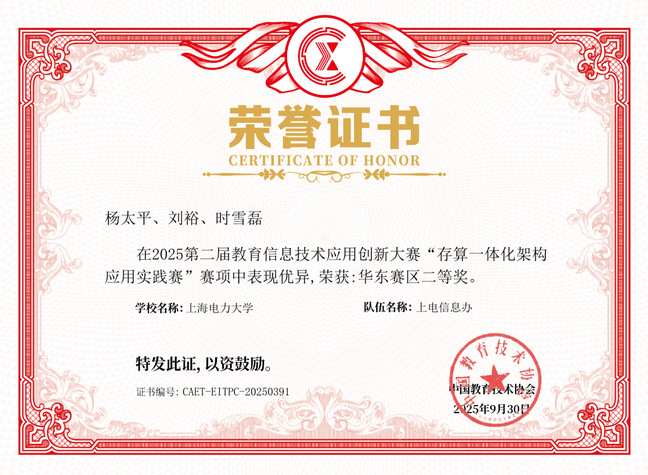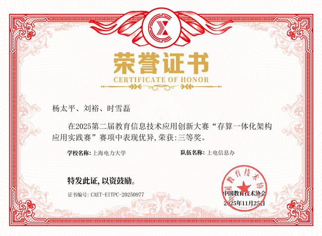 近日,由中国教育技术协会主办,浙江大学、中国教育技术协会网络安全专委会承办的“2025第二届教育信息技术应用创新大赛—存算一体化架构应用实践赛”全国总决赛在浙江大学(紫金港校区)圆满落幕。我校信息化与数据管理中心杨太平、刘裕、时雪磊组建的“taptap体育信息办”团队在“存算一体化架构应用实践赛”赛项中表现优异,先后荣获华东赛区二等奖及全国总决赛三等奖。