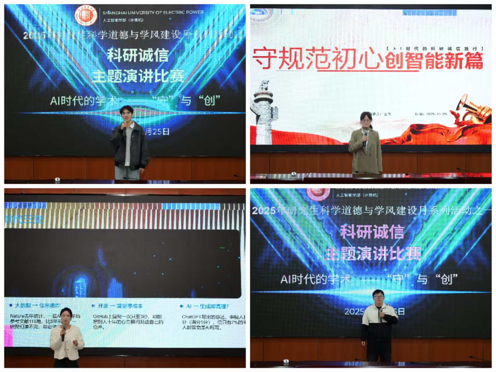 11月,人工智能学部聚焦研究生科学道德培育与优良学风建设,精心组织开展“代码之上·诚信为光”主题活动月系列活动。活动紧扣人工智能与计算机学科专业特色,创新融合经验分享、海报创作、演讲思辨等多元形式,精准对接研究生科研成长需求,全方位引导学子树立正确学术价值观、筑牢科研诚信底线,着力营造守正创新、风清气正的科研育人环境,为培育德才兼备的高素质创新型专业人才筑牢思想根基。