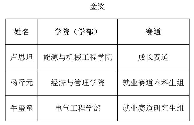 最终,能源与机械工程学院卢思坦获成长赛道金奖、经济与管理学院杨泽元获就业赛道本科生组金奖、电气工程学部牛玺童获就业赛道研究生组金奖。