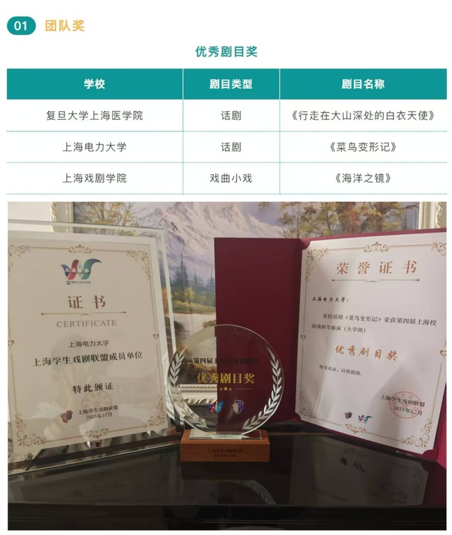 由我校章贇老师指导,校大学生话剧团演出的剧目《菜鸟变形记》经过初赛、复赛的激烈角逐,从百余部戏剧作品中脱颖而出,与复旦大学上海医学院和上海戏剧学院演出剧目同获大学组优秀剧目奖,是我校在此项比赛中的突破。我校也凭借此次获奖成为上海市学生戏剧联盟成员单位。