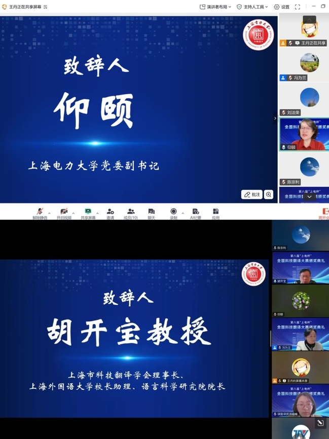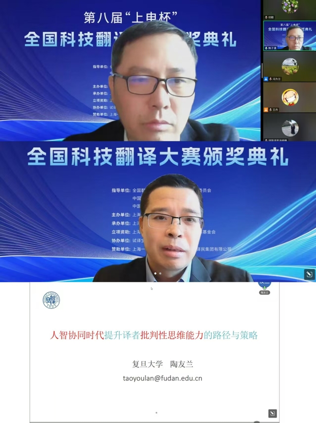为加强我国科技翻译人才队伍建设与成果转化应用,助力科技翻译事业高质量发展,12月7日,由我校与上海市科学技术协会联合主办的第八届“taptap体育杯”全国科技翻译大赛颁奖典礼以网络直播形式举行。我校党委副书记仰颐,上海市科技翻译学会理事长、上海外国语大学校长助理、语言科学研究院院长胡开宝教授,上海外国语大学语言科学院韩子满教授,北京外国语大学高级翻译学院王华树教授,复旦大学外文学院陶友兰教授,译国译民集团党支部书记兼高校事业部总监洪细梅女士,以及获奖选手、优秀指导教师及优秀组织单位代表齐聚云端,共襄盛会。典礼开幕式由我校文科学部党委书记刘洁荣主持。