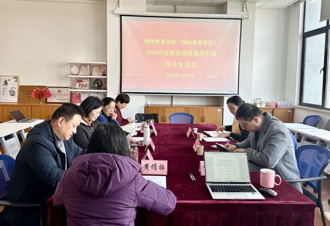 2025年1月8日下午,继续教育学院(国际教育学院)2024年度处级党员领导干部民主生活会在杨浦校区明理楼501室召开。校第七督导组组长李永斌,副组长诸俊到会指导。继续教育学院(国际教育学院)党总支班子全体成员参会,会议由党总支书记、院长江晓花主持。